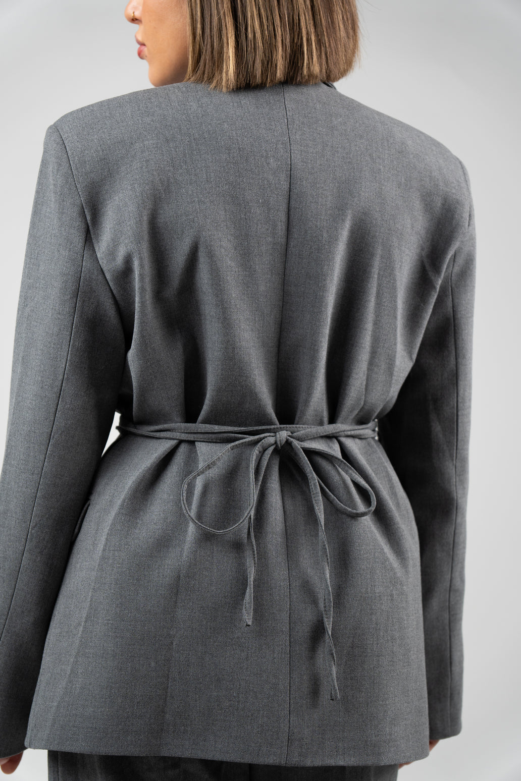 De Blazer Twinset met Strikdetail – Grijs is een prachtig ensemble gemaakt van hoogwaardig, dik weefsel. De broek met hoge taille heeft een wijde pijp, wat zorgt voor een elegante en eigentijdse uitstraling. De blazer kan op twee verschillende manieren worden gedragen en wordt aan de voorkant gestrikt met een bijpassende ceintuur, wat een flatterend, getailleerd effect geeft. Dit setje combineert vrouwelijkheid perfect met verfijnde stijl en is een onmisbaar stuk in elke garderobe.